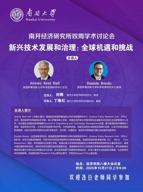 讲座摘要:新兴技术指处于快速发展阶段,具有突破性、应用领域广泛和融合互补性特征,能够产生显著经济社会影响力的技术创新集群,例如,人工智能、量子计算和脑机接口。近年来,充分认识到新兴技术对经济社会发展的促进作用,包括美国和中国在內的世界主要国家纷纷布局新兴技术发展。本次讨论会特邀请在新兴技术研究领域的著名专家英国萨塞克斯大学科学政策研究中心的Jeremy Kent Hall(杰里米·霍尔)教授和Daniele Rotolo(达尼埃莱·罗托洛)教授来南开经济研究所,共同研讨新兴技术发展和治理对中国和全球经济社会发展的影响。