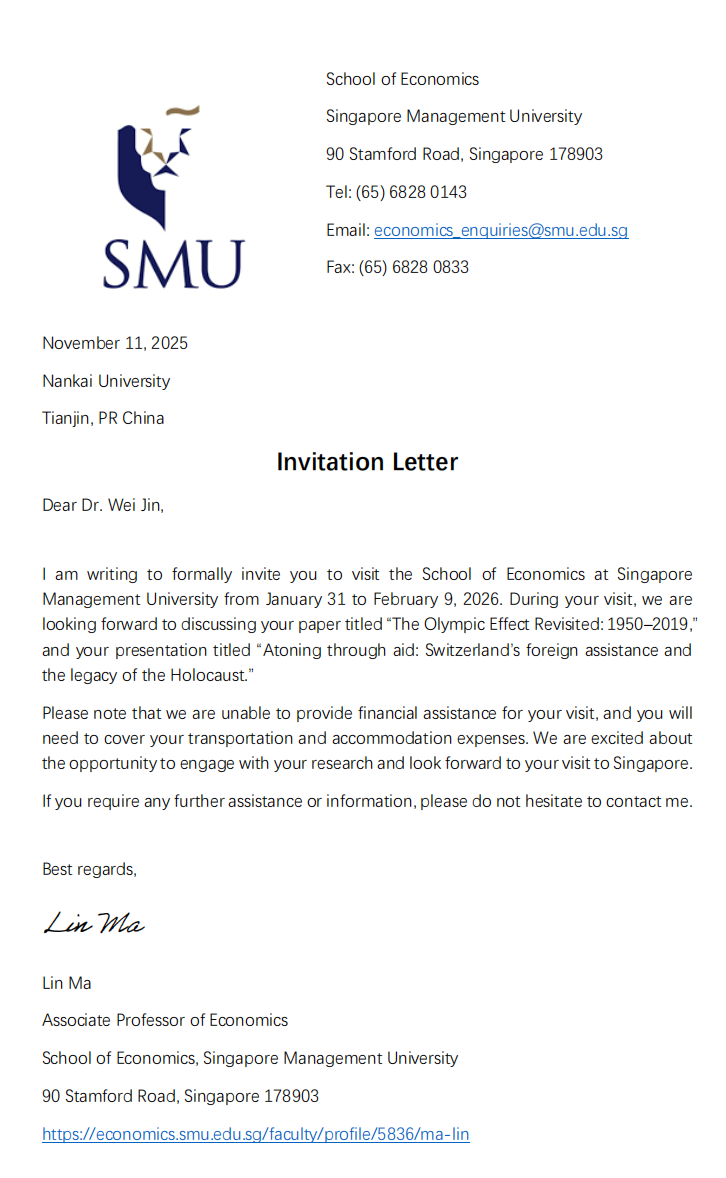 南开大学经济学院金威拟于2026年1月31日至2026年2月9日因公出访新加坡,共计10天。根据《南开大学因公出国(境)管理办法》,现就相关情况进行公示,公示期为5个工作日。如有异议,可向我院反映。