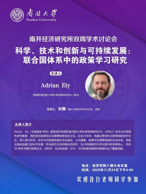 主讲人简介: Adrian Ely(艾德里安·伊利)教授现任英国萨塞克斯大学科学政策研究中心(SPRU)技术与可持续性研究教授,同时担任政策培训与高管教育项目主任。过去 25 年间,他通过跨学科与跨领域的研究方法,深入探讨科学、技术与可持续发展在农业食品、公共健康、能源与交通等领域的互动关系。他曾主编或合著三部学术专著,在全球五大洲开展合作研究,为 23 种国际同行评议期刊担任审稿人,并在 36 种学术期刊发表论文,对科学、技术和创新(STI) 与可持续发展研究领域作出了重要贡献。