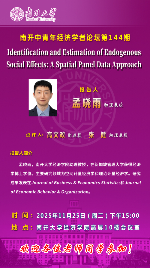 报告人简介:孟晓雨,南开大学经济学院助理教授,在新加坡管理大学获得经济学博士学位。主要研究领域为空间计量经济学和理论计量经济学。研究成果发表在Journal of Business & Economics statistics和Journal of Economic Behavior & Organization。