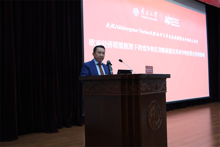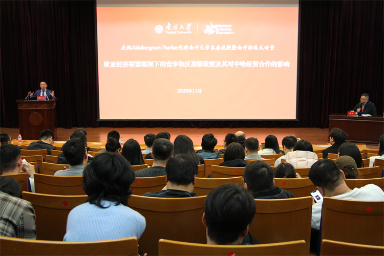 11月22日,哈萨克斯坦国立大学竞争和价格政策研究中心主任、哈萨克斯坦Narxoz大学一级教授阿尔达伯格诺夫·努尔兰(Aldabergenov Nurlan)应邀做客南开经济大讲堂,以“欧亚经济联盟框架下的竞争和反垄断政策及其对中哈经贸合作的影响”为题为南开师生作学术讲座。南开大学与哈萨克斯坦欧亚国立大学中外合作硕士学位教育项目学员、经济学院师生代表等约200人参加。讲座由经济学院负责人主持。