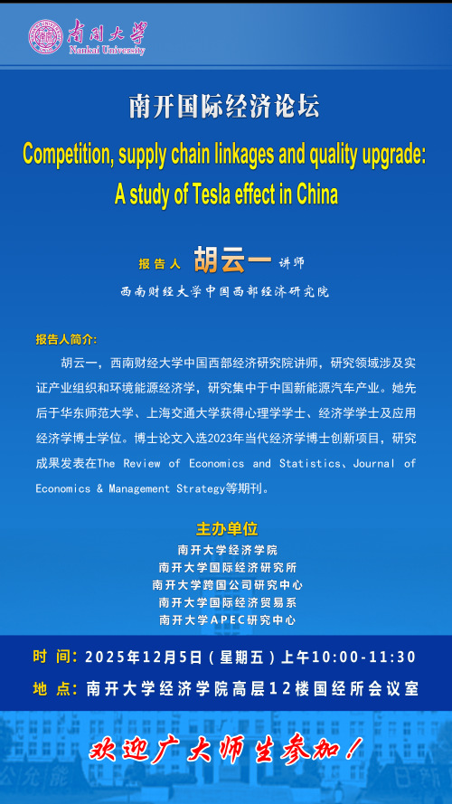 报告人简介:胡云一,西南财经大学中国西部经济研究院讲师,研究领域涉及实证产业组织和环境能源经济学,研究集中于中国新能源汽车产业。她先后于华东师范大学、上海交通大学获得心理学学士、经济学学士及应用经济学博士学位。博士论文入选2023年当代经济学博士创新项目,研究成果发表在《The Review of Economics and Statistics》《Journal of Economics & Management Strategy等期刊。。