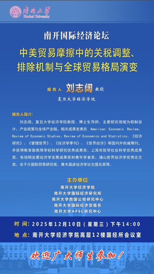 报告人简介:刘志阔,复旦大学经济学院教授、博士生导师。主要研究领域为税制设计、产业政策与全球产业链,相关成果发表在 American Economic Review、Review of Economic Studies、Review of Economics and Statistics、《经济研究》、《管理世界》、《经济学季刊》、《世界经济》等国内外权威期刊,并获得教育部高等学校科学研究优秀成果奖、上海市哲学社会科学优秀成果奖、张培刚发展经济学发展成果奖和青年学者奖、浦山世界经济学优秀论文奖、安子介国际贸易研究奖、青木昌彦经济学论文提名奖等。