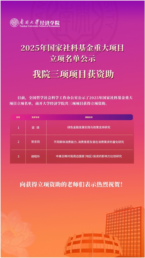 日前,全国哲学社会科学工作办公室公示了2025年国家社科基金重大项目立项名单,南开大学经济学院共三项项目获得立项资助。