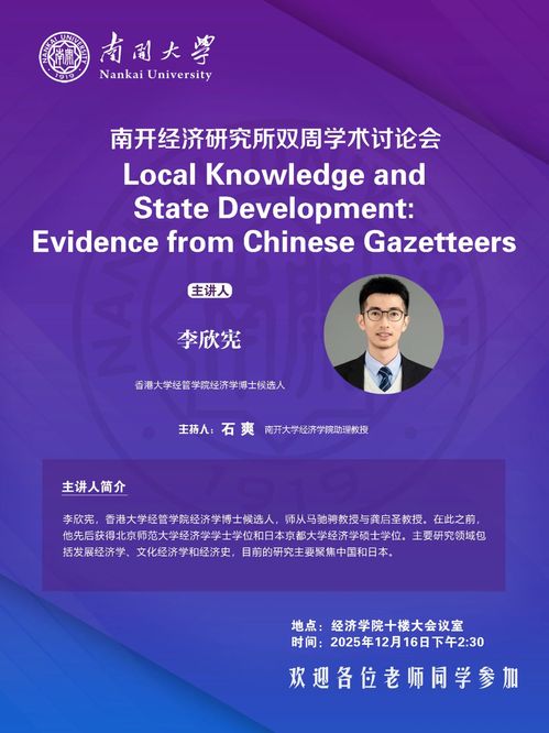 主讲人简介: 李欣宪,香港大学经管学院经济学博士候选人,师从马驰骋教授与龚启圣教授。在此之前,他先后获得北京师范大学经济学学士学位和日本京都大学经济学硕士学位。主要研究领域包括发展经济学、文化经济学和经济史,目前的研究主要聚焦中国和日本。
