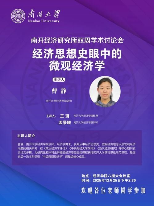 主讲人简介:曹静,南开大学经济学院讲师,经济学博士,长期从事经济思想史、微观经济理论以及宏观经济问题的相关研究,在《政治经济学评论》《中央财经大学学报》《当代经济研究》等核心期刊发表论文多篇,为研究生和本科生讲授的经济思想史类课程获得南开大学课程思政示范课程,是国家级一流本科课程“中级微观经济学”课程组核心成员。