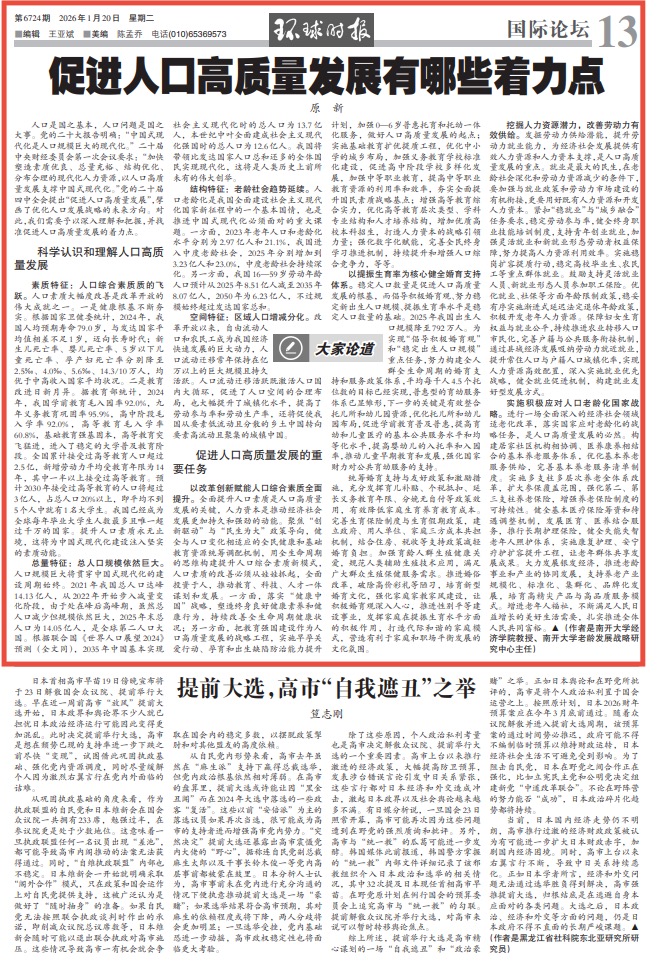 人口是国之基本,人口问题是国之大事。党的二十大报告明确:“中国式现代化是人口规模巨大的现代化。”二十届中央财经委员会第一次会议要求:“加快塑造素质优良、总量充裕、结构优化、分布合理的现代化人力资源,以人口高质量发展支撑中国式现代化。”党的二十届四中全会提出“促进人口高质量发展”,擘画了优化人口发展战略的未来方向。对此,我们需要予以深入理解和把握,并找准促进人口高质量发展的着力点。