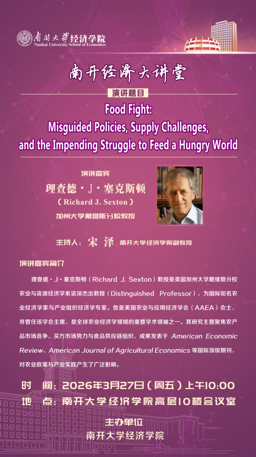 理查德·J·塞克斯顿(Richard J. Sexton)教授是美国加州大学戴维斯分校农业与资源经济学系资深杰出教授(Distinguished Professor),为国际知名农业经济学家与产业组织经济学专家。他是美国农业与应用经济学会(AAEA)会士,并曾任该学会主席,是全球农业经济学领域的重要学术领袖之一。其研究主要聚焦农产品市场竞争、买方市场势力与食品供应链组织,成果发表于 American Economic Review、American Journal of Agricultural Economics 等国际顶级期刊,对农业政策与产业实践产生了广泛影响。