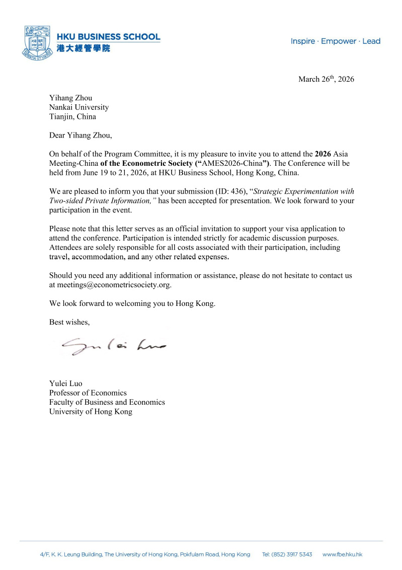 6月19日-6月21日:在香港大学参加计量经济学会2026年亚洲会议(中国);