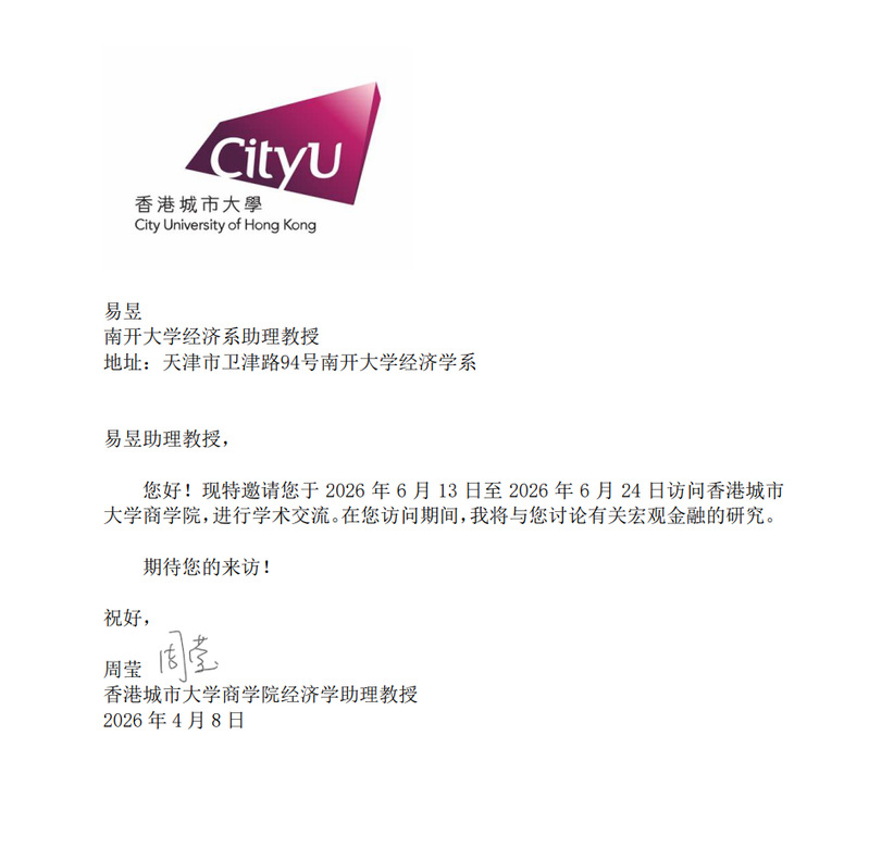 南开大学经济学院易昱拟于2026年6月13日至2026年6月24日因公出访中国香港,共计12天。根据《南开大学因公出国(境)管理办法》,现就相关情况进行公示,公示期为5个工作日。如有异议,可向我院反映。